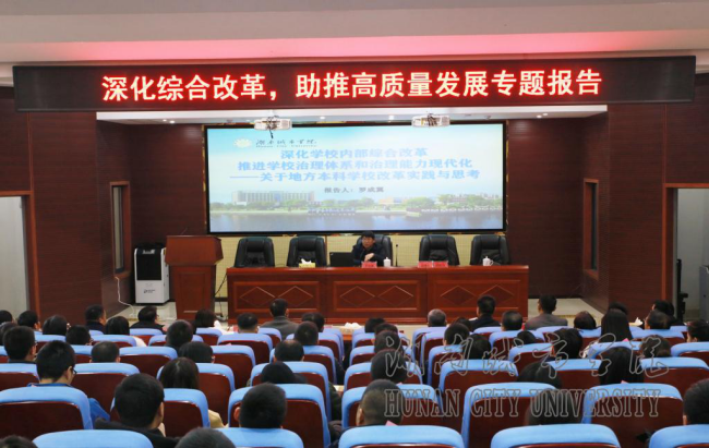 罗成翼详细阐述了2016年以来我校推进综合改革的背景、谋划、举措、成效、保障及特点。他指出,学校新班子上任后,以“建什么样的城市学院,如何发展城市学院”为主题,在全校范围内深入开展“转型发展、内涵发展、特色发展” 大讨论活动,形成了“一二三五”发展战略。着力推进“六破六立”综合改革,以大改革推进快发展。人才培养质量明显提高,办学效益明显增强,核心竞争力明显提升,社会反响全面向好。学校构建了班子抓“四力”、干部抓“六(八)条”、党建抓“二三五工程”的从严治党话语体系,把坚持党的领导、加强党的建设贯穿高校改革发展和立德树人的全过程,将党建的“红色势能”转化为发展的“工作动能”。