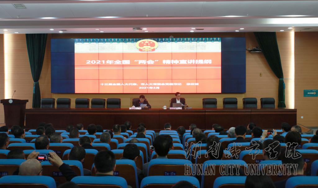 2021年3月25日下午,我校在图书馆报告厅举行2021年度党委理论学习中心组(扩大)第三次集体学习。第十三届全国人大代表,益阳市人大常委会党组书记、常务副主任徐云波应邀来校作2021年全国“两会”精神宣讲。全体校领导、全体副处(含)以上干部、党支部书记、学生辅导员参加会议。宣讲会由党委书记罗成翼主持。