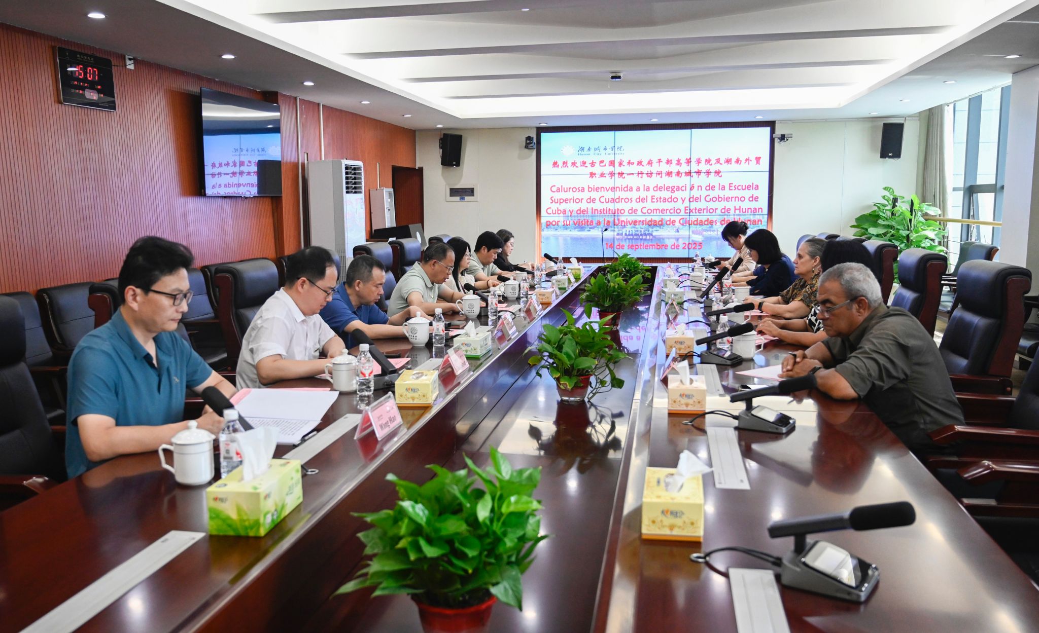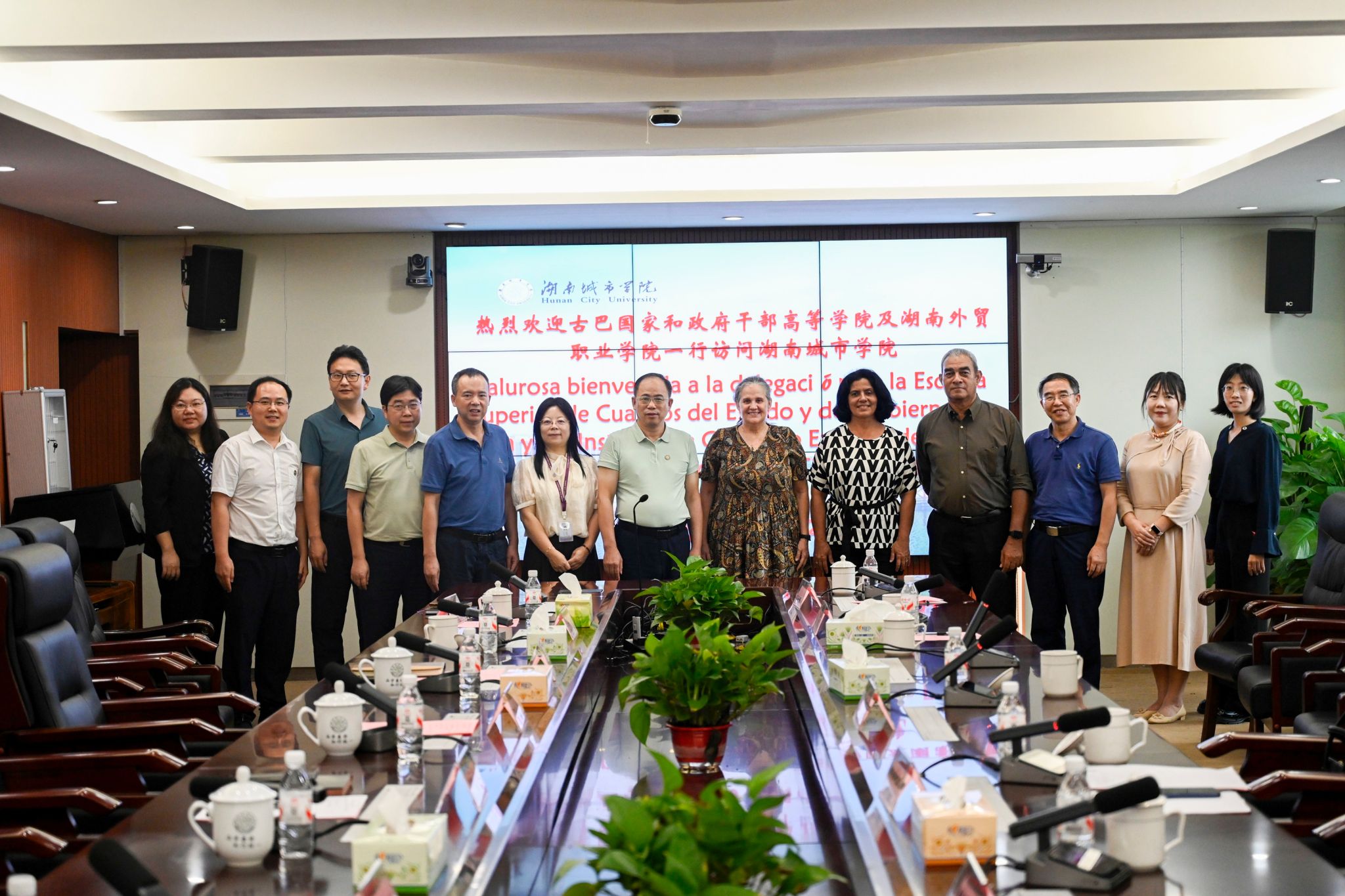 本网讯(通讯员 杜林远)9月14日,古巴国家和政府干部高等学院校长梅赛德斯・德尔加多・费尔南德斯、副校长安娜・格洛丽亚・纳瓦罗・彭顿,湖南外贸职业学院副校长桂诚等代表团一行到访我校,旨在深化国际教育交流、拓展合作边界。