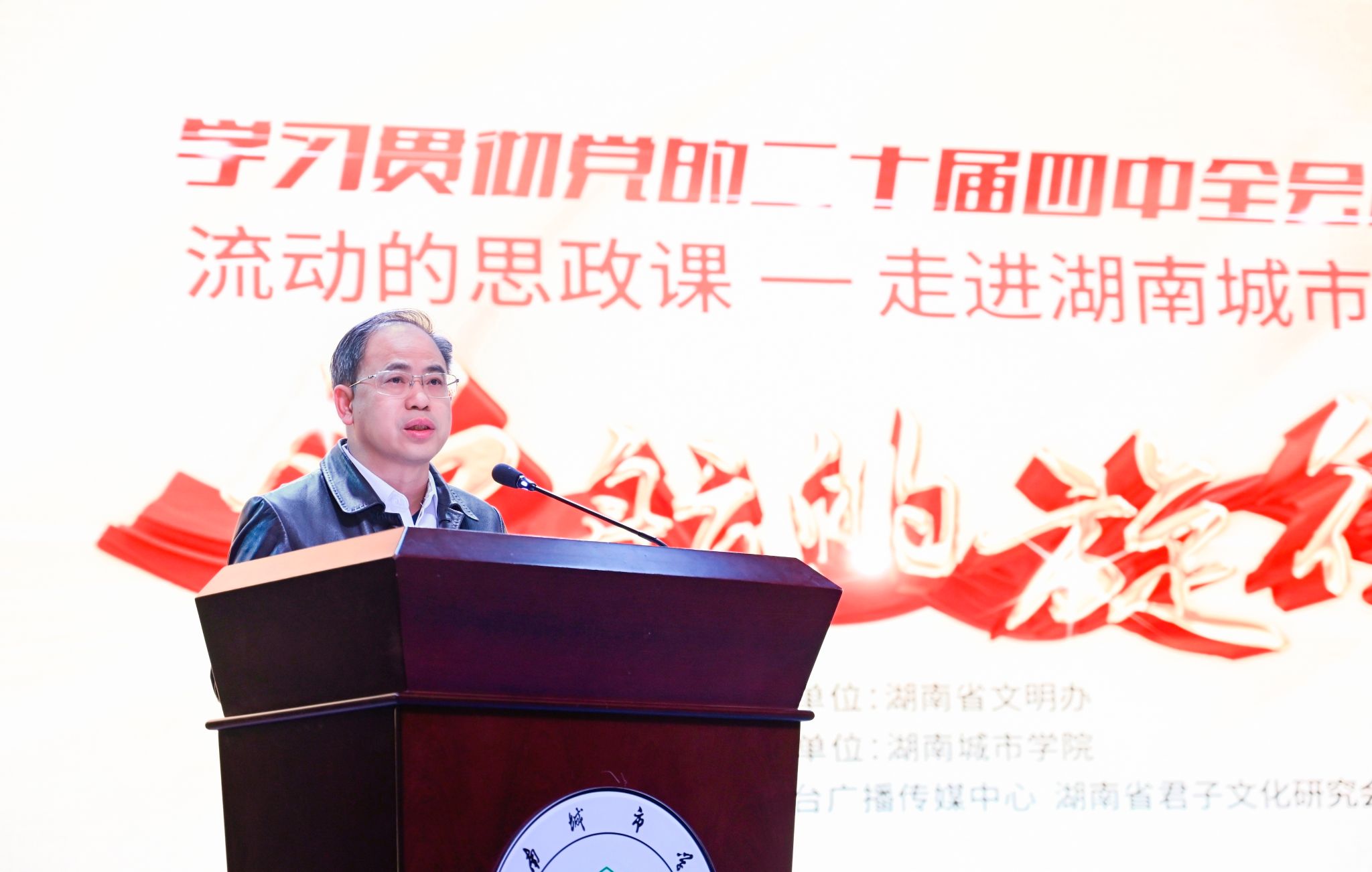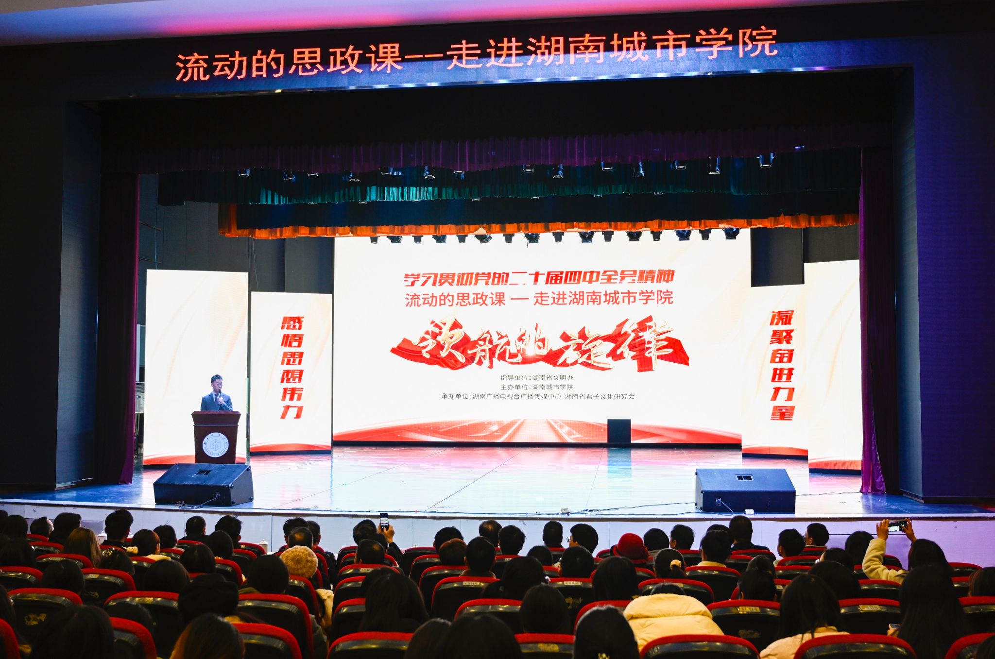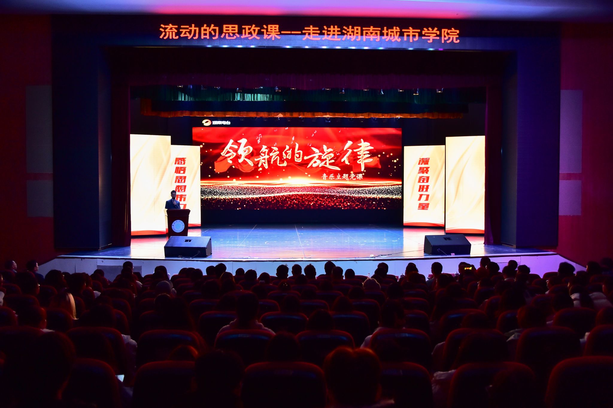“让党的创新理论变得可感可知、可亲可近,是一堂全程“坐得住、听得进、记得牢”的红色思政课,是一部引导青年学生坚定理想信念、厚植家国情怀的生动教材。”校党委书记何振在致辞中表示,益阳是中国共产党湖南最早的农村党支部诞生地和《山乡巨变》策源地,这些历史元素和红色基因在城院熠熠生辉。学校始终坚持为党育人、为国育才的初心使命。此次“领航的旋律”走进校园,是一次成功的创新实践,学校将以此次活动为契机,持续用好红色资源、讲好奋斗故事。