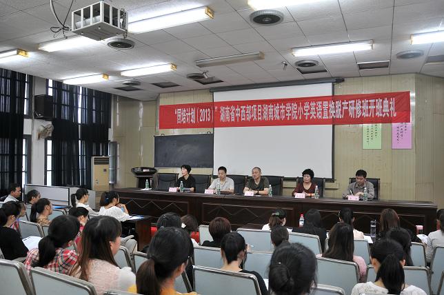 ,“国培计划”湖南省中西部项目九游官方端入口小学英语置换脱产研修班开班典礼在我校朝阳校区图书馆报告厅举行,继续教育学院、外国语学院相关负责人和研修班50名学员参加了仪式。
