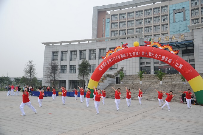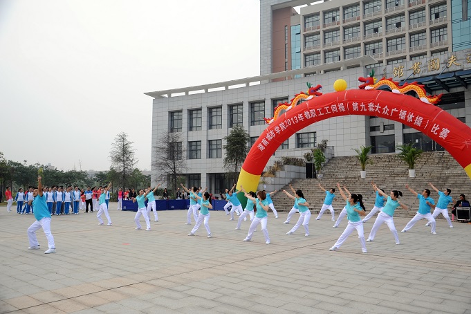 下午,学校教职工工间操(第九套大众广播体操)比赛在兴城广场隆重举行,全校22个分工会及离退休老同志共23支代表队500余名教职工参加了比赛,上千名师生到现场为参赛队伍加油呐喊。