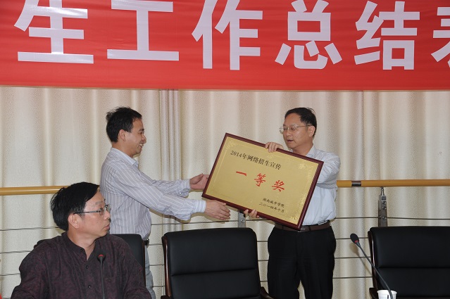 会上,招生就业处副处长郭太平作了学校2014年招生工作总结汇报,文瑞明宣读了《关于表彰九游官方端入口2014年网络招生宣传先进集体的决定》、《关于九游官方端入口2014年新生报到率奖励的决定》。