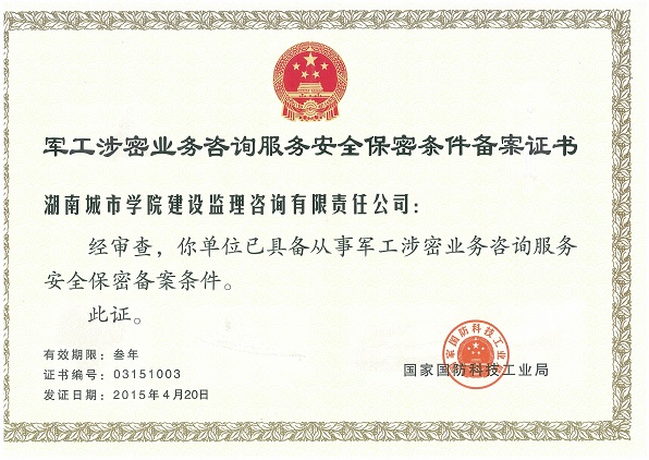 (本网讯)近日,国家国防科技工业局向我校监理公司颁发了《军工涉密业务咨询服务安全保密条件备案证书》,并将监理公司正式列入《军工涉密业务咨询服务单位备案名录》。我校监理公司也成为湖南省为数不多被列入该名录的监理单位之一。