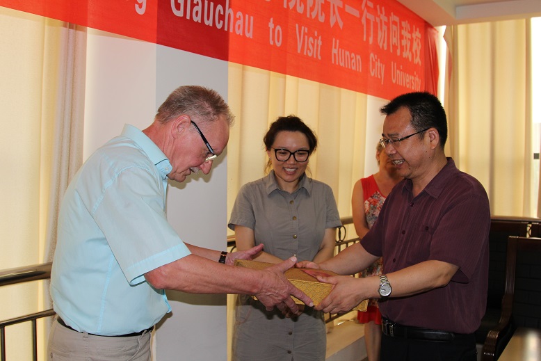 在交流会上,校长李建奇代表学校向Dr. Horst Jaehnert一行的到来表示热烈欢迎,并向客人赠送了极具湖湘特色的湘绣工艺品。