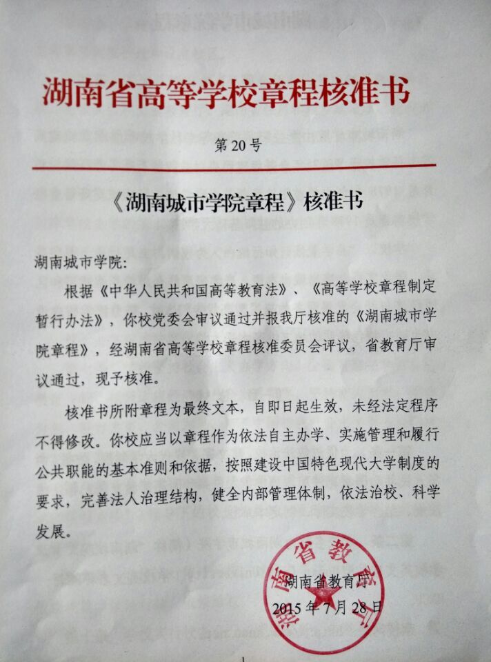 (本网讯)经湖南省高等学校章程核准委员会评议, 7月 28日 ,湖南省教育厅审议通过了《九游官方端入口章程》,章程于核准之日起正式生效。