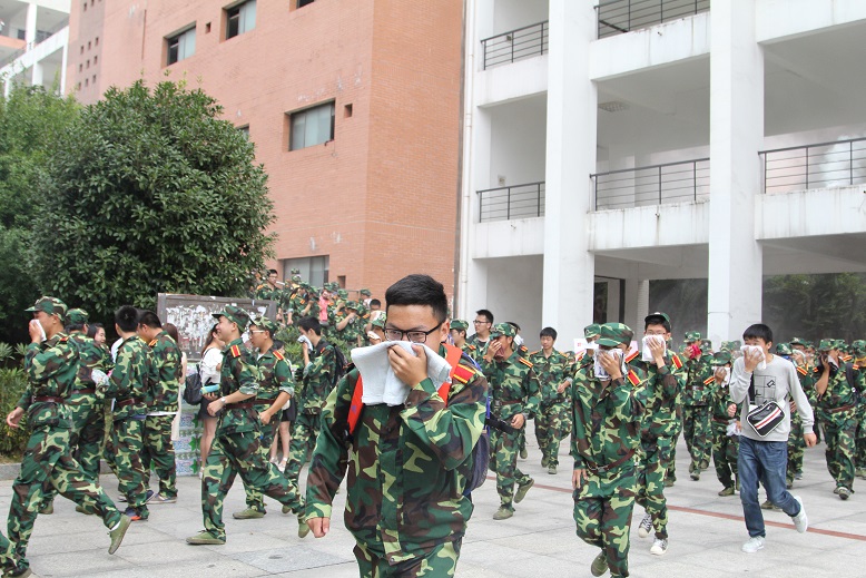 中午1250随着模拟烟雾弹在二教学楼升起,疏散演练正式开始。4000名新生在教官的带领下,弯着腰、猫着步,用湿毛巾捂住口鼻,沿着安全疏散标志快速前进,有序撤离到安全地带。
