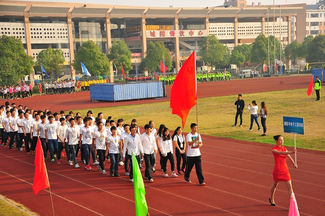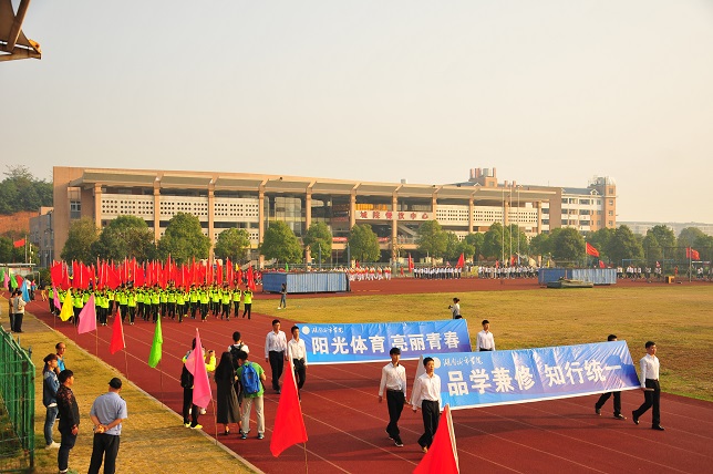 在红旗方阵的引领下,裁判员方阵、志愿者方阵、15个二级学院运动员方阵、教职工运动员方阵踏着欢快的运动员进行曲依次入场。在雄壮的国歌声和激昂的校歌声中五星红旗和校旗冉冉升起。