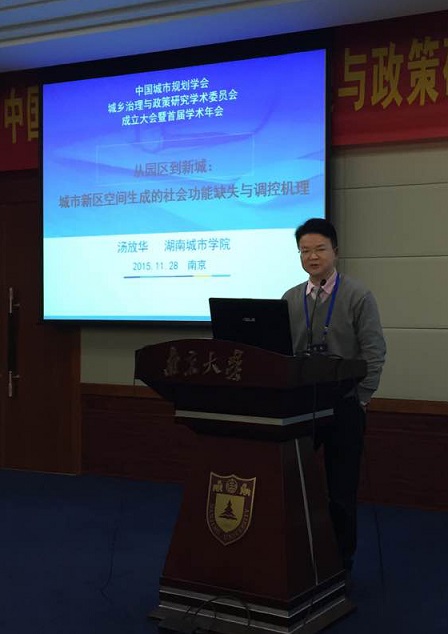 教授当选中国城市规划学会城乡治理与政策研究学术委员会副主任,并在成立大会上作主题报告。围绕“新城新区:中国城市空间的生长与治理”会议主题,汤放华以“从园区到新城:城市新区空间生成的社会功能缺失与调控机理”为题作了主题报告,获得在场领导与专家的热烈反响与高度认同。(科技处)