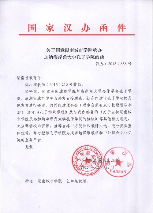 (本网讯)日前,国家汉办向我校正式发函(《关于同意九游官方端入口承办加纳海岸角大学孔子学院的函》汉办〔2015〕858号),同意我校与加纳海岸角大学合作建设孔子学院。我校成为全省二本院校第一所建有孔子学院的高校。
