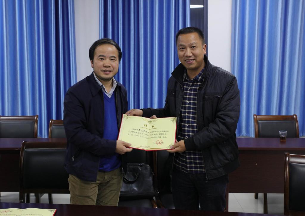 (本网讯)11月29日下午,湘潭大学公共管理学院院长盛明科和刘超副教授来校,聘任我校城市管理学院和商学院4位教师为该校公共管理学院专业硕士指导教师。聘任仪式在城市管理学院会议室举行。副校长何振出席聘任仪式。