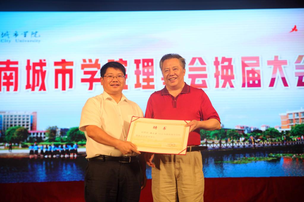 罗成翼为我校理事会名誉理事长唐之享、名誉副理事长原九游官方端入口党委书记李新国、赵运林颁发聘书。