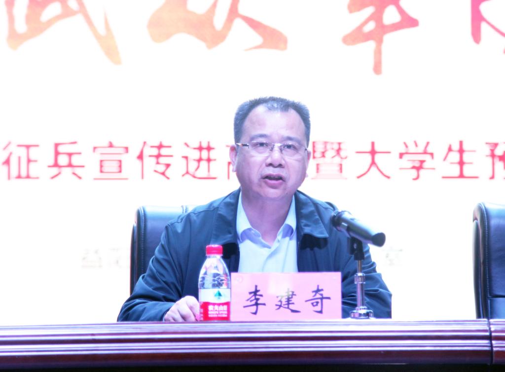 李建奇代表学校致辞。他指出,建设一支听党指挥、能打胜仗、作风优良的新型人民军队,迫切需要有知识、有文化、有担当的优秀大学生到部队建功立业。近年来,学校党委高度重视大学生征兵工作,坚持拧紧学生理想信念的“总开关”,注重红色基因传承,发挥先进典型示范,细化征兵服务。“文能提笔安天下,武能上马定乾坤”。他鼓励我校学子主动投身到祖国最需要的地方去,用实际行动去实践家国情怀!
