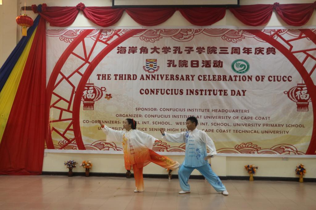 接下来,孔院师生为庆典表演了精彩的文艺节目。《服装秀》、诗朗诵《将进酒》、歌曲《水调歌头》、《失恋阵线联盟》、笛子演奏、加纳传统舞蹈、武术表演等节目,为现场观众带来了一场视觉盛宴,获得了阵阵掌声。