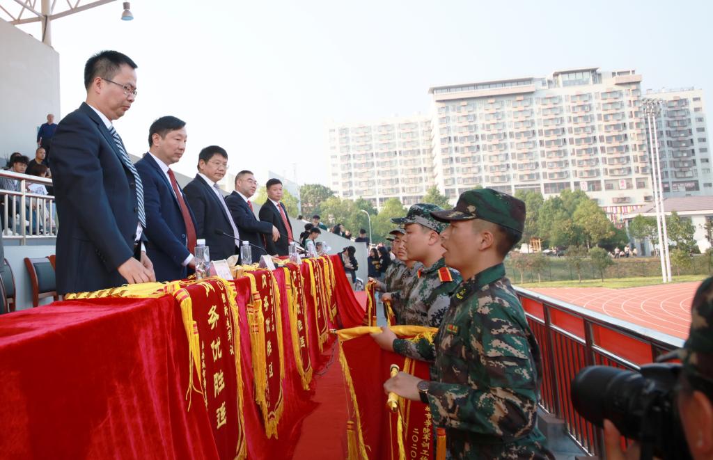 李斌宣读了我校2020级新生军训表彰决定:市政与测绘工程学院2营、材料与化学工程学院8营等5个营获得内务优胜营称号,管理学院4营等15个连获得内务优胜连称号,土木工程学院3营等5个营获得训练先进营称号,建筑与城市规划学院“规心一建”方阵等15个方阵获得优秀方阵称号,钟正武等8人被评为优秀辅导员,毛清仪等28人被评为优秀教官,高玉海等196人被评为军训标兵,土木工程学院的《军体拳》获得表演节目中的第一名。与会校领导为受表彰的集体和个人颁发了锦旗。