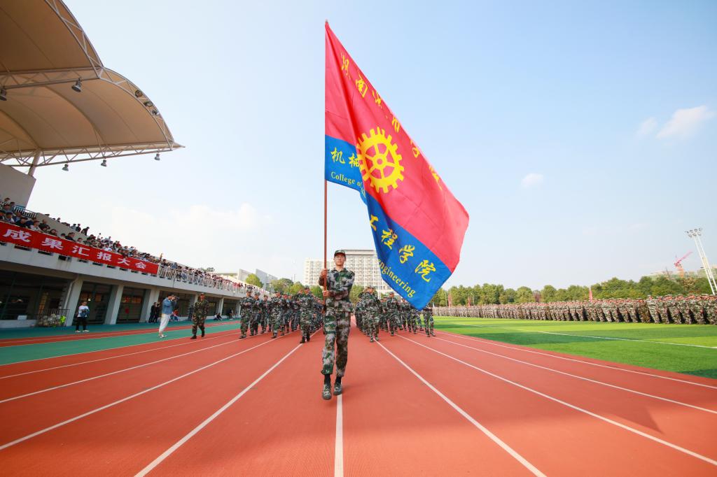 晴空如洗,红旗招展,军训成果汇报暨总结表彰大会在庄严、雄壮的国歌和校歌声中拉开帷幕。罗成翼检阅了由2020级参训新生组成的方阵。伴随分列式进行曲的响起,教官方阵率先进场,他们迈着铿锵有力的步伐,用沉着自信的精神面貌,展现了军人的风采。紧接着迎来13个学院的方阵,他们迈着雄健的步伐,喊着响亮的口号,保持昂扬的士气,依次从主席台前通过,接受学校领导和在场师生的检阅。