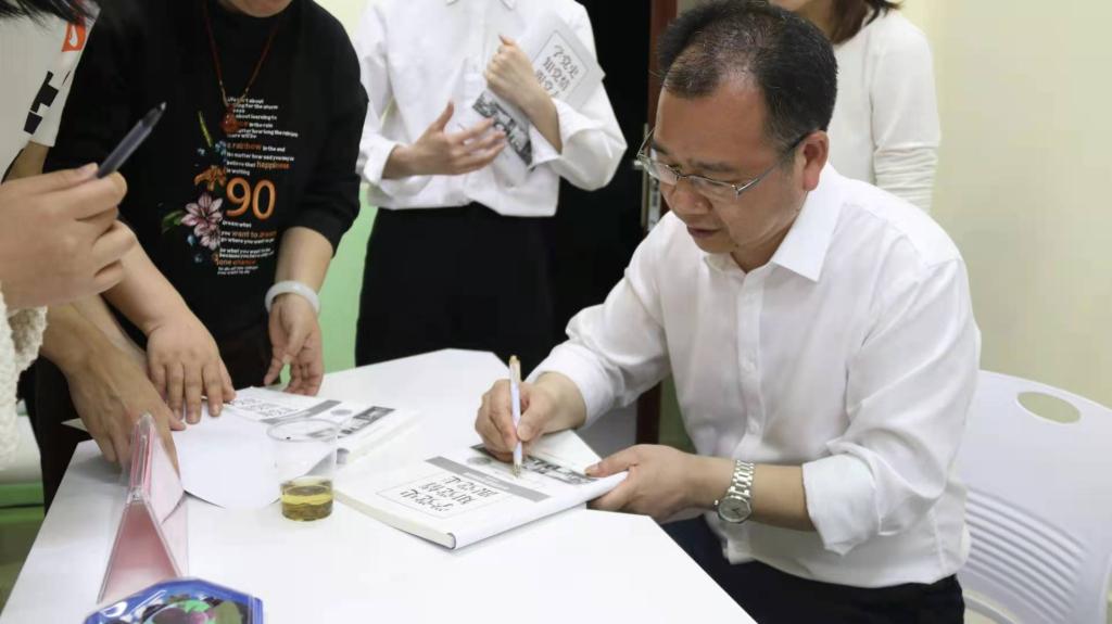 党委书记李建奇为同学签名赠书。