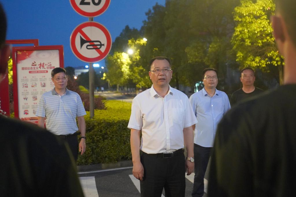 本网讯(通讯员 余洪)2021年7月12日,离学生放假已过去三天,但部分因故留校的学子们的生活、学习状况仍牵动着学校领导和教师的心。晚上8点,学校党委书记李建奇,副校长袁志成、纪委书记陈列尊在学工部相关人员陪同下,来到学生宿舍、值班室和军训教导队集训现场,看望慰问了留校的学生和值班的教职工,检查了军训教导队训练情况。