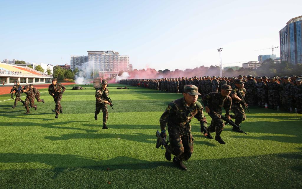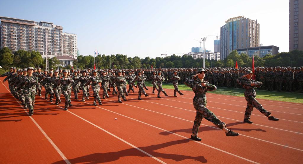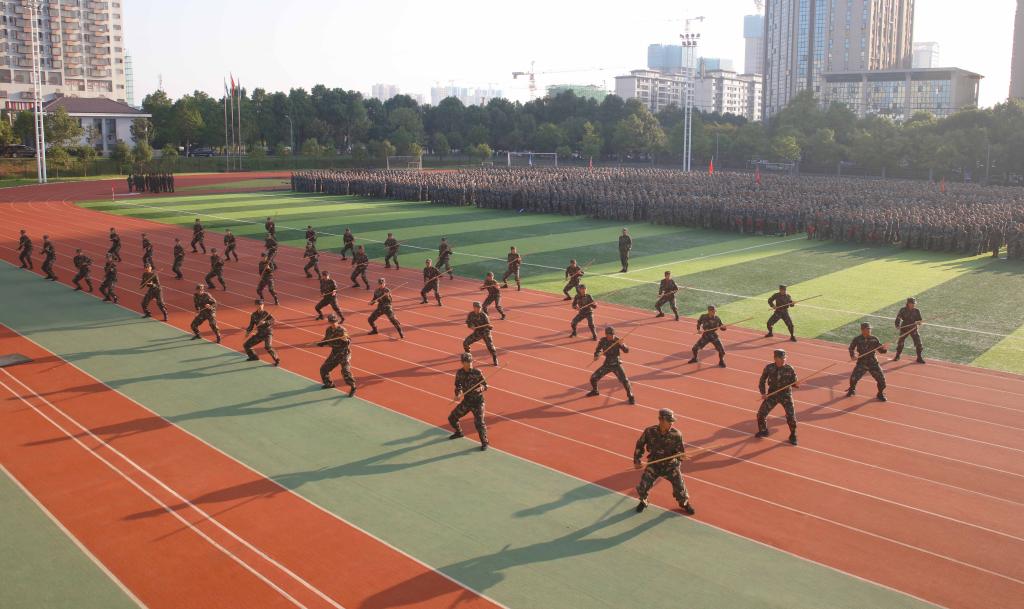在庄严的国歌声中,五星红旗冉冉升起,全场以饱满的热情齐唱国歌,向国旗行注目礼。汤放华宣布军训成果汇报表演正式开始。