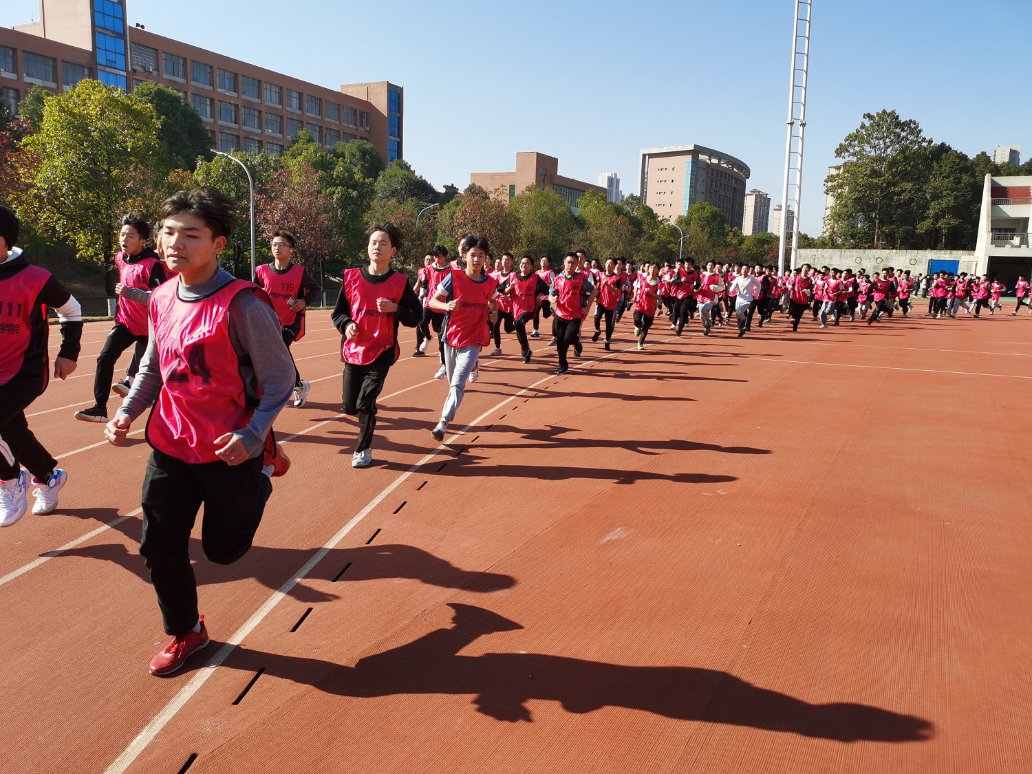 本次比赛分非体育专业(甲组)男子组、女子组;体育专业(乙组)男子组、女子组;教师教育学院(丙组)男子组、女子组六个组别。起点为学校东田径场内100米终点处,逆时针方向经东田径场东门跑出,经体育训练馆前、一食堂南侧、学校西门、美艺楼、音乐楼南侧,再经学校南门、东门至东田径场东门后右跑半圈到达100终点处结束,全程约4000米。