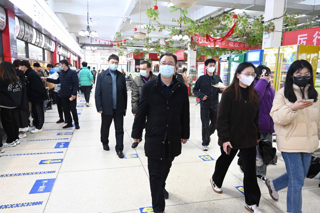 李建奇一行首先来到学校南门,看望慰问了寒风细雨中值勤的保安人员,询问了车辆、人员进出校园的管控情况,要求保卫部门务必要加强对人员的管控,不折不扣执行好人员进入校园须“核验身份、测体温、扫场所码、戴口罩”的规定动作,把好疫情防控第一道关口。随后,李建奇一行来到防控办了解了防疫物资储备情况,查看了工作台账,并向工作人员询问了我校全员核酸检测的完成情况。他表示,防疫办要细化防疫举措,认真做好人员摸排、管控,严格落实核酸检测,为全校两万多师生筑牢安全防线。李建奇一行还来到第三食堂,对就餐环境、师生个人防护等进行了检查。