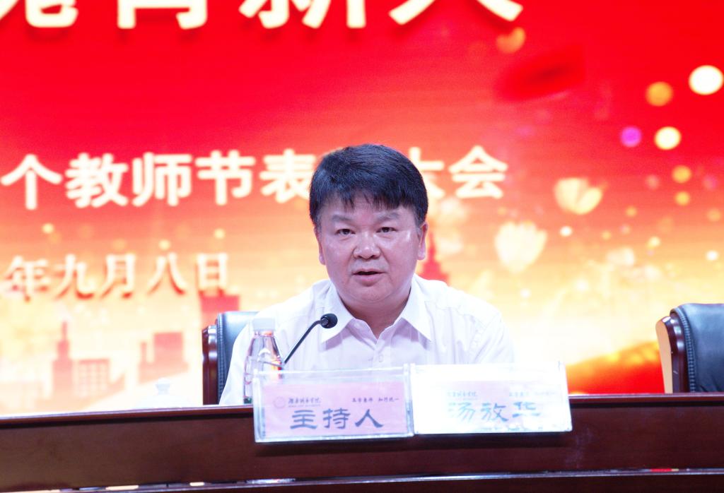 本网讯(通讯员 雷欢)三尺讲台,三寸舌,三寸笔,三千桃李;十年树木,十载风,十载雨,十万栋梁。2022年9月8日下午,我校庆祝第38个教师节暨表彰大会在音乐厅举行。全体校领导、机关处室负责人、二级学院领导及受表彰对象、教师代表等200多人参加了大会。大会由校长汤放华主持。
