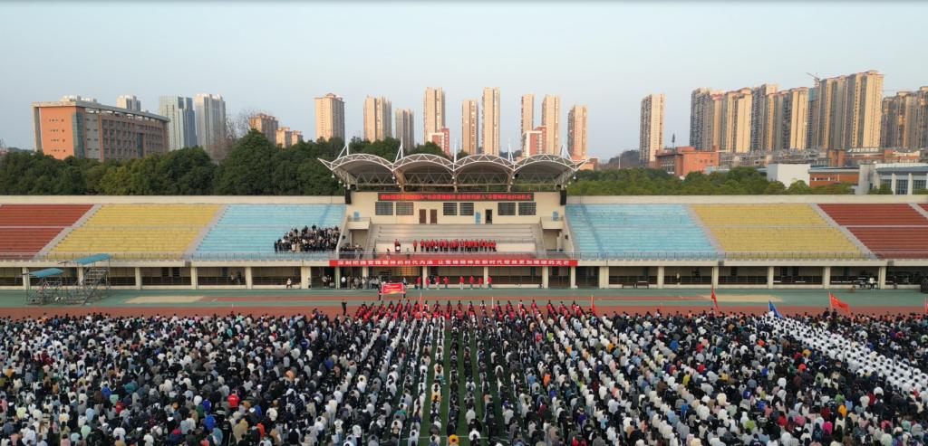 接下来的全体师生宣誓把气氛推向了高潮,大家高举右拳,在鲜艳的五星红旗下,六千多人发出的青春昂扬的誓言响彻田径场。