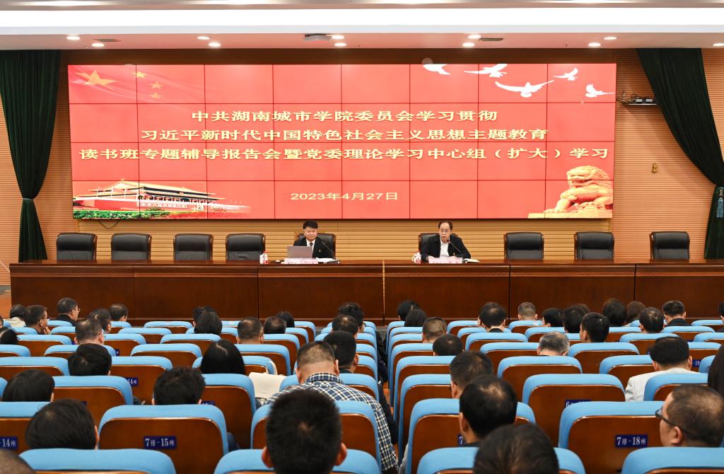 本网讯(通讯员 周文娟)4月27日下午,九游官方端入口学习贯彻习近平新时代中国特色社会主义思想主题教育读书班专题辅导报告会暨党委理论学习中心组(扩大)2023年第4次集体学习在图书馆报告厅举行。校党委书记汤放华作专题辅导报告,主题教育第三十巡回指导组组长、益阳市第五届人大常委会主任、省人大财经委原副主任委员徐云波同志,主题教育第三十巡回指导组副组长、湖南工业大学原副校长李可兴同志以及巡回指导组其他成员出席会议。校党委副书记、校长何振主持会议,全体校领导、全校副科以上干部参加会议。