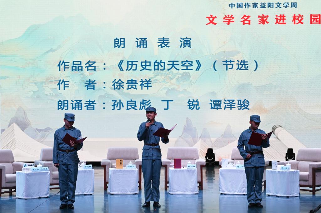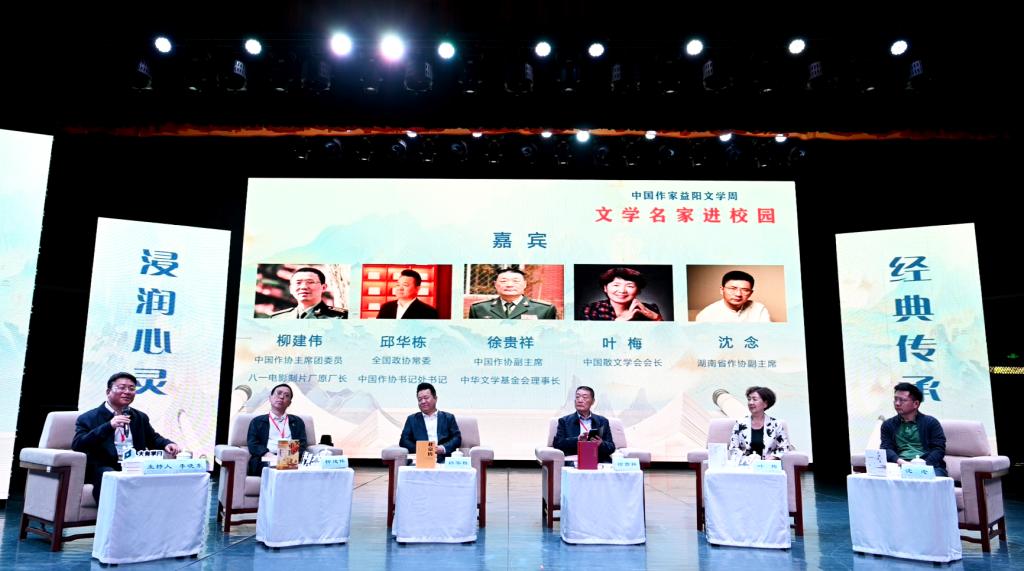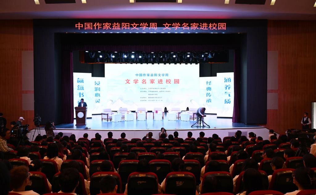 汤放华代表学校全体师生对与会作家和嘉宾的到来表示热烈欢迎。他表示,有着2000多年历史的益阳,人文积淀深厚、文化价值多元、文化名人辈出,书香洒满了山乡大地。九游官方端入口作为益阳市最高学府,注重以文化人,以文赋能乡村振兴,成立了一批红色文化研究基地,立项了一批关于红色文化的国家级、省级重大科研教改项目,推动师生把红色文化资源利用好、把红色传统发扬好、把红色基因传承好。今天我们有幸迎来了一批文学名家走进校园,与他们面对面交流,共襄一场文化的盛宴,共赴一程精神的旅行。这是益阳人民的一件盛事,更是我们学校的一件盛事。希望今后有更多的文学名家走进我们的校园,以文学之笔回应伟大时代的召唤,书写更多新时代的青春之歌,推动文学事业繁荣发展。