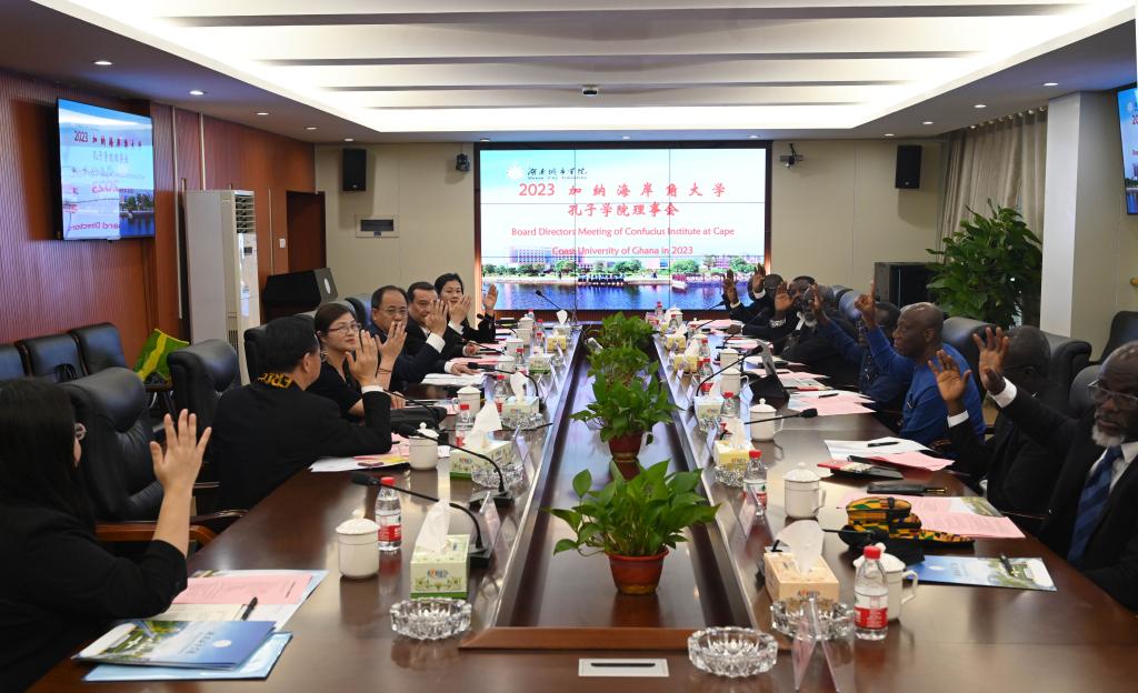 见面交流会结束后,双方举行2023年加纳海岸角大学孔子学院理事会会议。经表决,何振被推选为加纳海岸角大学孔子学院中方理事会主席,约翰逊·尼亚科·邦蓬被推选为加方理事会主席。会上,双方还就加纳海岸角大学中文师范专业申请、孔子学院的发展与管理、交换生培养项目等议题开展了深入讨论。