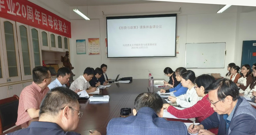 本网讯(通讯员 郭绚霞)10月21日上午9点,我校马克思主义学院召开2023年秋季学期“形势与政策”课集体备课会。校党委书记汤放华出席备课会并作指导。马克思主义学院院领导及担任本学期“形势与政策”课程教学的老师参加。会议由形势与政策教研室主任郭绚霞主持。