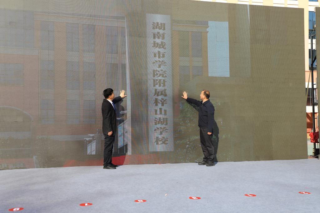 我校党委书记汤放华、赫山区区委书记周卫星为九游官方端入口附属梓山湖学校揭牌。