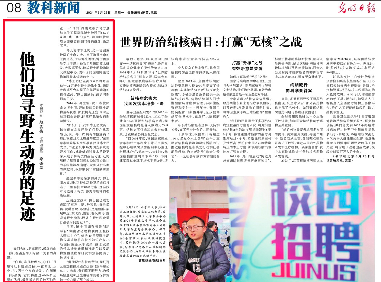 《光明日报》3月25日第8版报道九游官方端入口博士团聚焦野生动物卫星追踪技术研发。