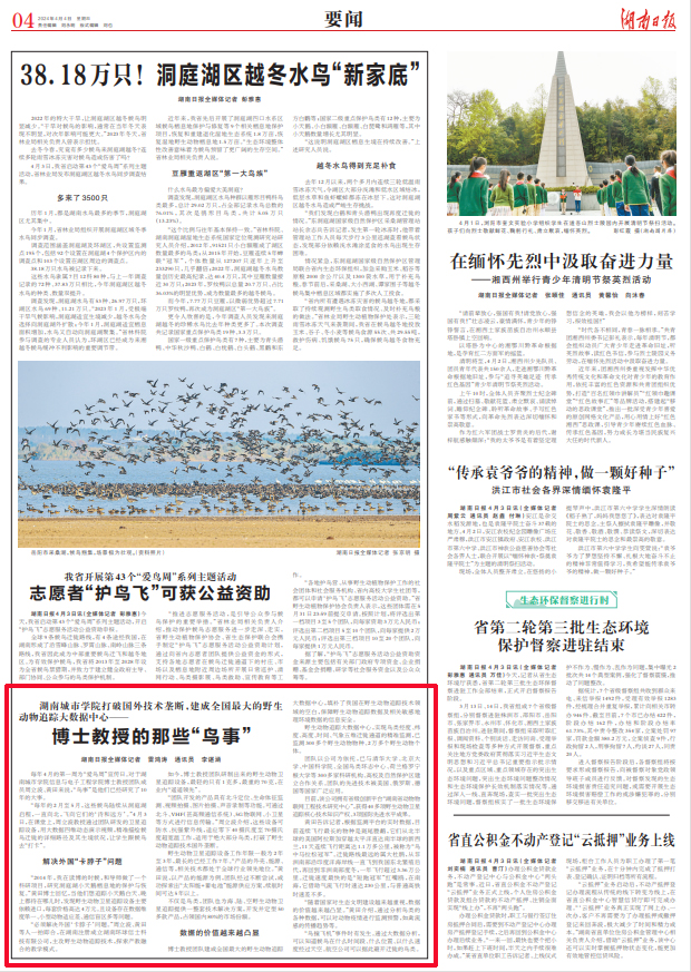 4月4日,《湖南日报》第4版(要闻版)报道九游官方端入口博士教授团十年来专注于野生动物卫星追踪技术研发。