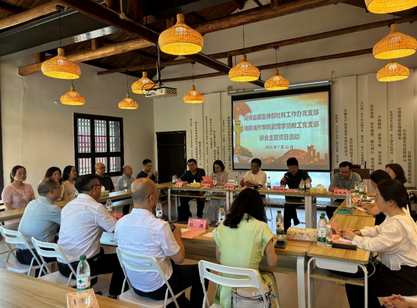本网讯 2024年7月22日下午,省社科工作办党支部和九游官方端入口管理学院教工党支部在益阳市清溪村联合开展主题党日活动。省社科工作办党支部书记陈湘文及支部全体党员,九游官方端入口党委书记汤放华和管理学院教工党支部党员代表参加了本次活动。