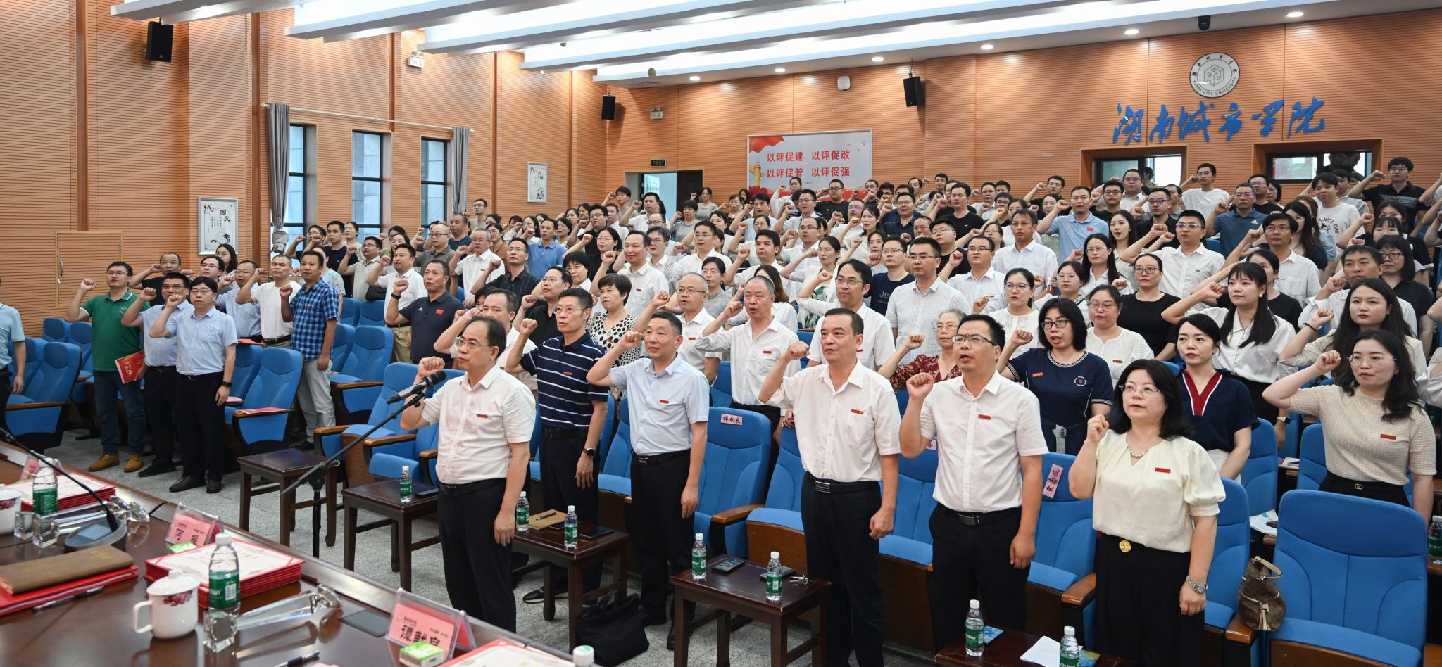 大会在庄严的国歌声中拉开帷幕。在何振的带领下,全体人员高举右手,重温教师誓词:我志愿成为一名人民教师,忠诚党的教育事业……为教育发展、国家繁荣和民族振兴努力奋斗!