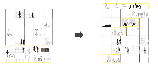 屋顶公共空间手段——打造贴近住户生活,且不失趣味的空间。置入框架限定空间,带来一定包裹感。同时框架还能供租户晾晒及简易健身。再置入垂下及收纳卷置框架的帷幕,可围合出小组团空间,亦可形成全开敞空间。