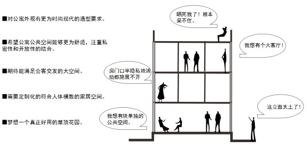居住区公共空间手段——由传统聚集型、宽裕的公共空间,转变为分散成小组团,紧贴核心筒的具有功能性的“公共客厅”