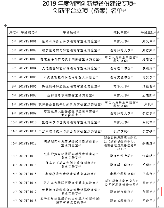 20191219日,湖南省科学技术厅发布了《关于2019年度湖南创新型省份建设专项创新平台立项(备案)的通知》,学院智慧城市能源感知与边缘计算湖南省重点实验室成功入选。