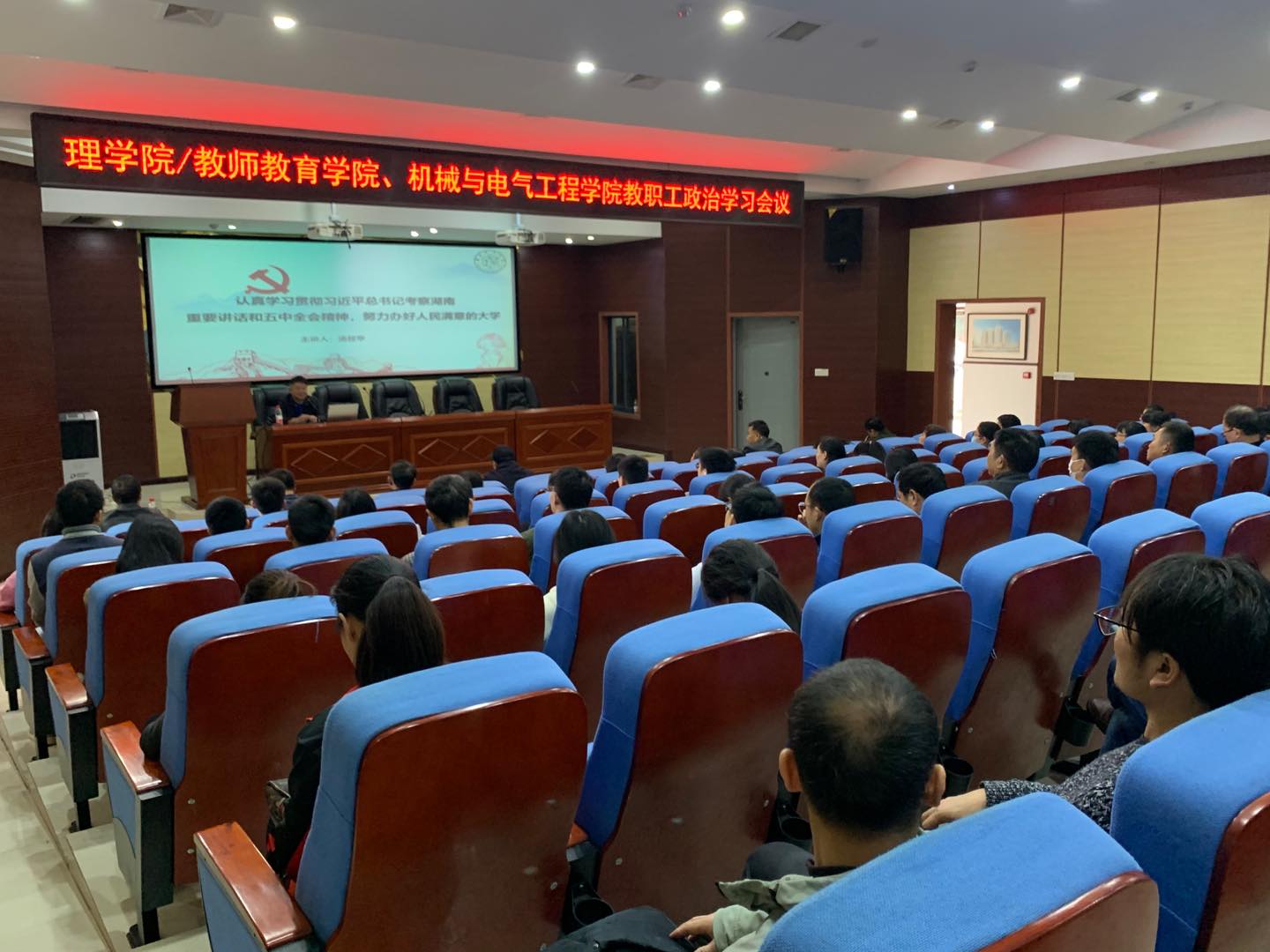 115下午机械与电气工程学院和理学院/教师教育学院在建规楼121报告厅举行教职工政治学习,专题学习习近平总书记考察湖南重要讲话和十九届五中全会精神学校党委副书记汤放华做了题为《认真学习贯彻习近平总书记考察湖南重要讲话和五中全会精神,努力办好人民满意的大学》的宣讲报告,两个学院的全体教职工参加了此次政治学习。