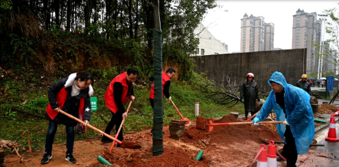 在和风细雨里,校领导汤书记和吕委员以实际行动带领大家积极投身于植树活动中,挥锹铲土、扶苗填坑,踏土夯苗,拎桶浇水,认真细致地完成每一道工序,亲手种下一棵棵香樟。