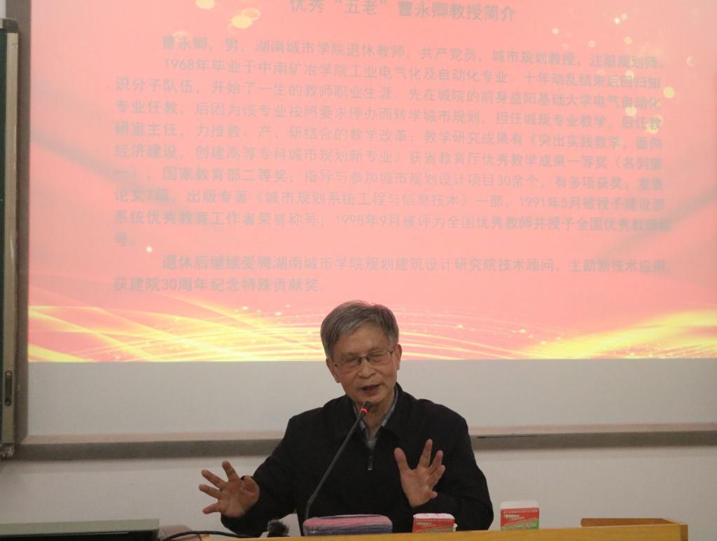 曹永卿,城市规划教授,注册规划师。1991年5月被授予建设部系统优秀教育工作者荣誉称号;1998年9月被评为全国优秀教师并授予全国优秀教师称号。退休后继续受骋九游官方端入口规划建筑设计研究院技术顾问,主助新技术应用,获建院30周年纪念特殊贡献奖。曹永卿教授以“不忘初心,砥砺前行-我的教书育人”为题分享了个人成长奋斗的经历,勉励青年学生脚踏实地,努力奋斗,实现人生价值。