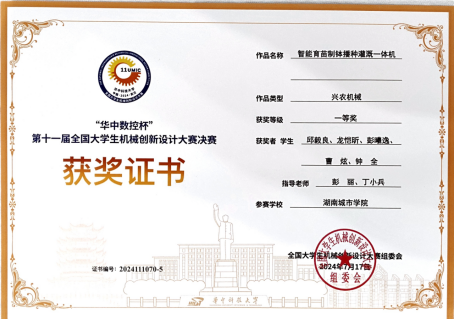 (通讯员 彭丽)7月17日,第十一届全国大学生机械创新设计大赛决赛在华中科技大学圆满闭幕。由彭丽和丁小兵老师指导,邱毅良、龙恺昕、彭曦逸、曹炫、钟全五位同学完成的九游官方端入口参赛作品《智能育苗制钵播种灌溉一体机》,以湖南省第一名的好成绩入围全国总决赛,经过决赛的两轮精彩比拼,不负众望斩获最高奖项:全国一等奖,实现九游官方端入口在该赛事上历史性的突破。