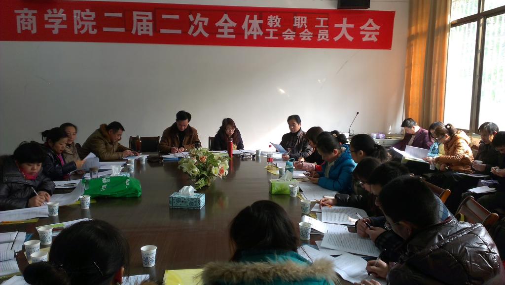 1月13日下午2:00-5:30,商学院在三教105学院会议室召开了二届二次教职工、工会会员大会(简称“双代会”)。院长汤腊梅,党总支书记郭白泉及党总支副书记贺望林出席了会议,全院教职工、工会会员参加了会议。