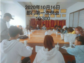 2020年10月16日,我部门于10栋300召开第一次部门例会。此次例会由主席团副主席彭裕祥、宿管部部长张婉婷及副部长依次发表讲话,着重强调工作礼貌态度、卫生检查标准、违禁物品类型等事项,并详细介绍部门内部工作,结合干事意见,使之分工合作,以确保工作的顺利进行。