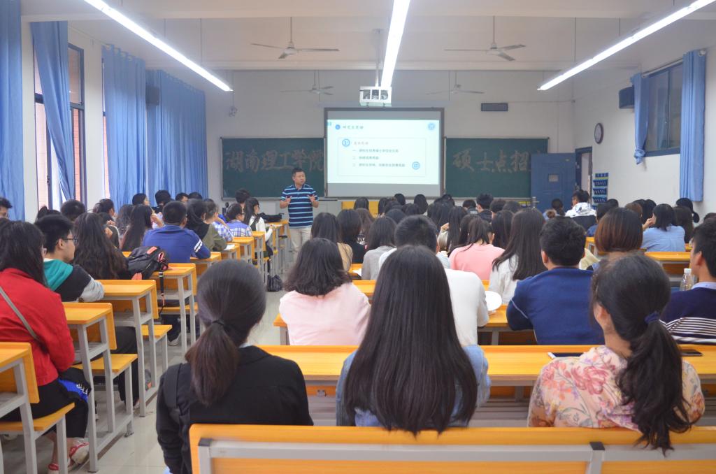 首先,管理学院分团委书记李姗对活动做简要介绍,并邀请湖南理工学院田小勇教授上台演讲。然后,田小勇教授简述了湖南理工学院的基本概况,他邀请同学们观看校园介绍视频,其主要记录了湖南理工学院的校园环境特点,也再现了部分学院学生认真学习的场景。视频的结尾提到学校对全体学生的殷切期望,并希望同学们认真领会“至善穷理,秉诚前进”的精神。紧接着,田教授重点介绍了学校经管学院的师资力量和学院的三个硕士点单位:应用经济学硕、会计学硕和旅游管理专硕,详细讲解三个硕士招生的主要研究方向和招生考试科目。最后,田教授提到该院充足的经费支持和研究生奖励,号召大家不忘初心,砥砺前行,坚持梦想,同时结合自身实际,把握机会,为国家做出贡献。至此,湖南理工学院的硕士点招生活动圆满结束。