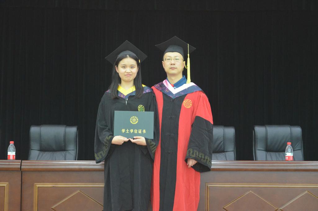仪式第二项,院长李教明为胡良超等16位校级优秀毕业生颁发学位证,并依次与各位校级优秀毕业生亲切地握手和交谈。