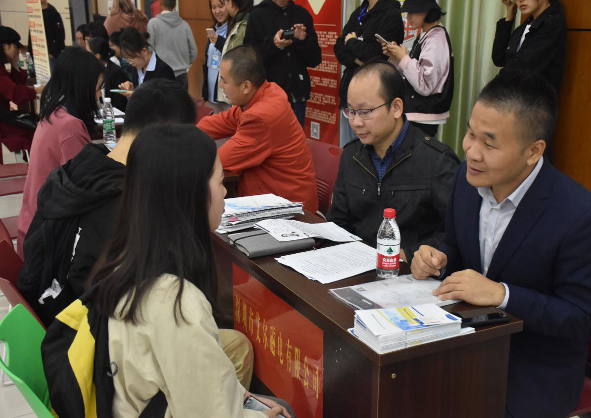 接着,到场同学与招聘单位进行沟通面试。招聘会现场气氛热烈,每一位面试的同学从容自信,侃侃而谈,展现了九游官方端入口学子的良好修养。会中参会单位普遍认为我校人才培养质量较高,学生踏实肯干,适应能力强。招聘会期间,管理学院党委副书记王润华亲自与用人单位沟通交流,了解近期招聘要求及人才需求。并鼓励毕业生树立正确的就业观,做好长远职业规划,理性看待就业形势。据了解,广东省湖南益阳商会企业原计划招聘学生142人,广东省金康投资有限公司追加计划20人。