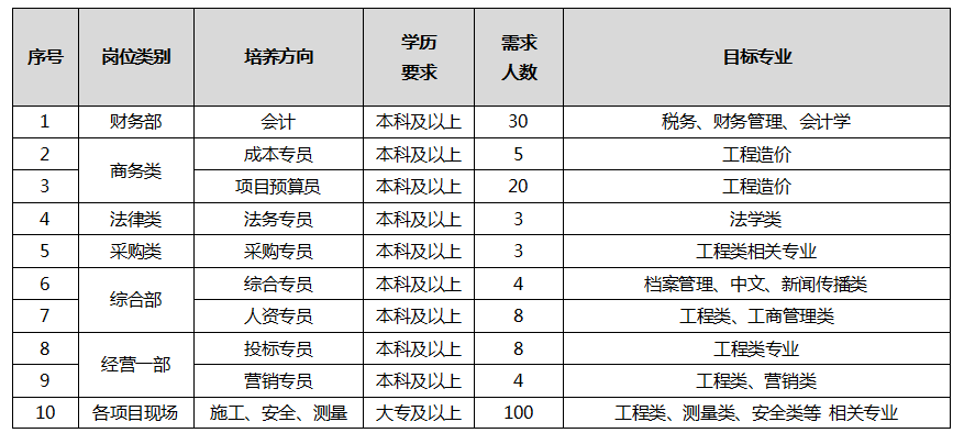 招聘专业:工程管理,管理学,工商管理,人力资源管理,劳动关系,公共关系学,土木工程