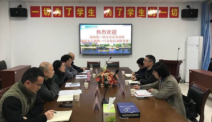 3月17日,湖南第一师范商学院副院长(主持工作)王朝晖、国贸系主任孟娟、旅游管理系主任彭小舟一行来管理学院考察交流,我院党委书记王正安、院长孙倩热情接待了王朝晖院长一行。在随后召开的座谈会上,刘刚副院长和任国平副院长分别介绍了我院在日常教学管理、教学成果奖培育、课程思政、科研项目培育、学科建设、硕士点建设等方面的做法和经验,孙倩院长主持座谈会。(通讯员:尹罡)